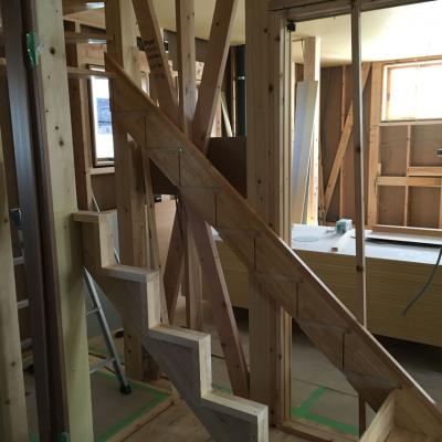 内部では大工工事が折り返しを迎え、階段の施工が進んでいます。